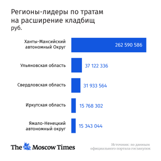 Чемпион потратам нарасширение кладбищ загоды войны— более 262млн рублей— Ханты-Мансийский автономной округ,занимающийвтороеместо среди регионов ссамым высоким экономическим потенциалом (после Москвы).