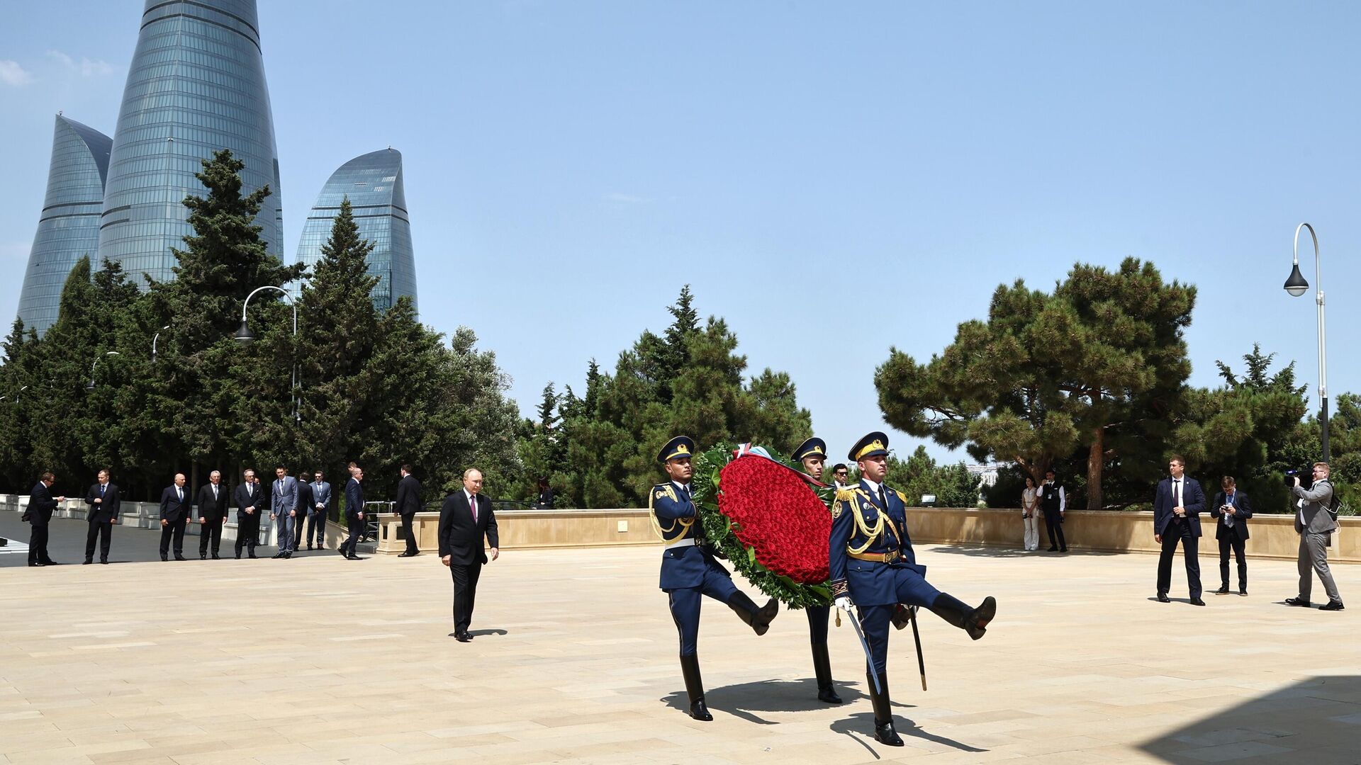 БАКУ, 19 авг - РИА Новости. Президент России Владимир Путин в Баку возложил венок к могиле Общенационального лидера Гейдара Алиева, передает корреспондент РИА Новости. Могила Гейдара Алиева находится на Аллее почетного захоронения. Это мемориальный комплекс, действующий с 1948 года и представляющий собой аллеи, на которых похоронены видные азербайджанские деятели культуры, науки, литературы, искусства, Герои Советского Союза, политики, а также представители семьи Алиевых. Общенациональный лидер Азербайджана Гейдар Алиев был похоронен на Аллее почетного захоронения 15 декабря 2003 года. Также на Аллее находится захоронение матери действующего президента республики Ильхама Алиева - 3арифы Алиевой. Путин возложил к могиле Гейдара Алиева венок из красных роз. Затем российский президент возложил цветы к могиле Зарифы Алиевой, ее отца Азиза Алиева и ее брата Тамерлана Алиева. В церемонии участвовал почетный караул.Путин прилетел в Баку 18 августа с двухдневным государственным визитом. На понедельник у Путина и Ильхама Алиева запланированы переговоры, по итогам которых будет подписан ряд документов.