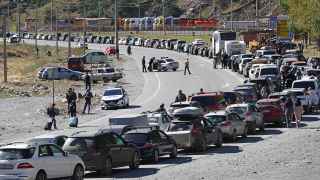 Люди и автомобили на дороге у КПП «Верхний Ларс» на российско-грузинской границе