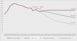Прогноз вцелом негативный. Нанаучно-практической конференции «Пути реализации нефтегазового потенциала Западной Сибири» обсуждалось состояние дел вХанты-Мансийском автономном округе— Югре— источнике примерно половины российской нефти. Заместитель губернатора округа Алексей Забозлаев продемонстрировал график трёх сценариев нефтедобычи.