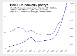 Военные расходы становятся все менее прозрачными ивреальности оказываются выше,чем сообщает Минфин. Так,в2023 году планировалось потратить 6,4трлн рублей. Но,судя покосвенным данным изотчетов обисполнении бюджета,вреальности потратили около 8трлн. Аналогично в2024 году будут потрачены неофициально объявленные 10,3трлн рублей,апримерно 12трлн. Объявленное увеличение военных расходов в2025 году до13трлн рублей уже невыглядит настолько большим. Впрочем,вреальности в2025 году траты могут оказаться выше.