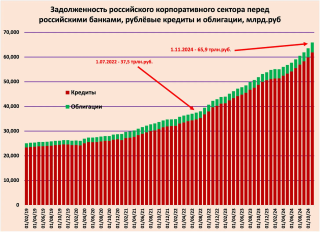 3. Банк России говорит о том,что задолженность корпоративного сектора перед банками (кредиты и облигации) на середину 2022 г. (точка,с которой Кеннеди начинает свой анализ) составляли 37,5 трлн рублей,на 1 ноября 2024 г. (последняя точка) – 65,9 трлн рублей. Т. е. совокупный прирост рублевой задолженности составил 28,4 трлн рублей. Очень грубо можно говорить,что вся задолженность корпоративного сектора выросла на $280 млрд. (Я не уверен,что есть какая-то бесспорная методика пересчета этой суммы в долларовый эквивалент,принимая во внимание,что в середине 2022 г. доллар стоил 50 рублей).