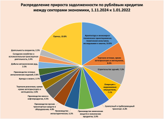 7. Данные Банка России о разбивке корпоративной задолженности по кредитам (без облигаций) можно найти в таблице «Задолженность,в том числе просроченная,по кредитам,предоставленным юридическим лицам — резидентам и индивидуальным предпринимателям,по классам ОКВЭД2»,которая находится вот здесь. На этих данных я разложил приросты задолженности по секторам и получилась вот такая картина. Предоставляю каждому сделать свою оценку того,что относится,а что не относится к ВПК,и подумать,можно ли принять на веру позицию Кеннеди,что более 70 процентов кредитов получили компании,связанные с военным производством.