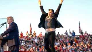 Илон Маск (в прыжке) правильно понял шефа (Дональд Трамп у трибуны)