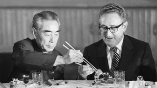 Чжоу Эньлай (слева),премьер госсовета КНР,и Генри Киссинджер,советник президента США Никсона по национальной безопасности. Чжоу сумел и не допустить взрывоопасного развития отношений с СССР,и тайно договориться с США. Сегодня ни такого политика,ни таких интересов у КНР нет