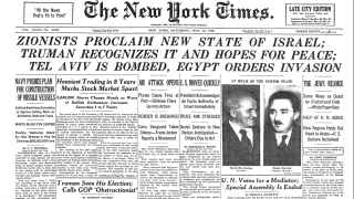 Газета The New York Times объявляет о создании Израиля. Труман признал независимость еврейского государства,Тель-Авив – под бомбежкой,Египет вторгся в Израиль