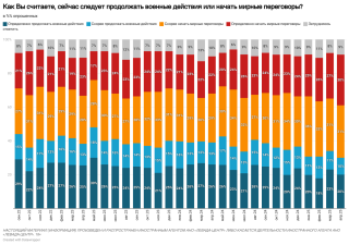 Вапреле 2025 года «за» продолжение военных действий высказались 30% россиян— минимальная доля сначала вторжения вУкраину,показал опрос «Левада-центра». Посравнению уровнями годичной давности провоенно настроенных граждан стало меньше на9 процентных пунктов,аесли сравнивать смартом 2022 года— на14 п.п.