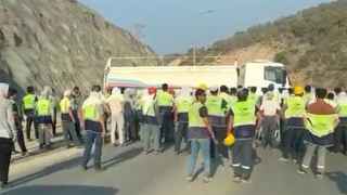Рабочие перекрыли дорогу около стройплощадки,отмечает издание. Они разбивают едущие кобъекту автомобили,требуя выплаты денег. Судя покадрам,против протестующих применили водометы,вответ они забросали камнями машину,которая поливала ихводой.