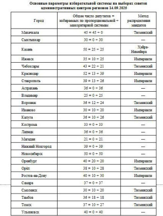 Выборы посмешанной системе пройдут в14 региональных центрах (включая Ставрополь сего досрочными выборами),помажоритарной— в10 ипопропорциональной— водном. Только вчетырех городах (Казань,Оренбург иТамбов) установлено равное или почти равное соотношение списочной имажоритарной частей,авостальных 10 региональных центрах мажоритарная часть преобладает (отдвух третей вСтаврополе,Воронеже,Иваново иСмоленске дотрех четвертей вКраснодаре иРостове-на-Дону).