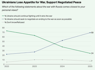 Поданным свежего социологического опроса,проведенного исследовательской службой Gallup с1 по14июля,большинство граждан Украины выступает заскорейшее завершение войны путем переговоров. Такую позицию поддерживают 69% респондентов. Лишь 24% продолжают настаивать нанеобходимости продолжать боевые действия дополной победы над Россией. Этот результат демонстрирует резкую смену общественного настроения посравнению с2022 годом. Тогда,согласно аналогичному исследованию Gallup,73% украинцев настаивали напродолжении сопротивления,тогда как только 22% высказывались впользу переговорного пути.