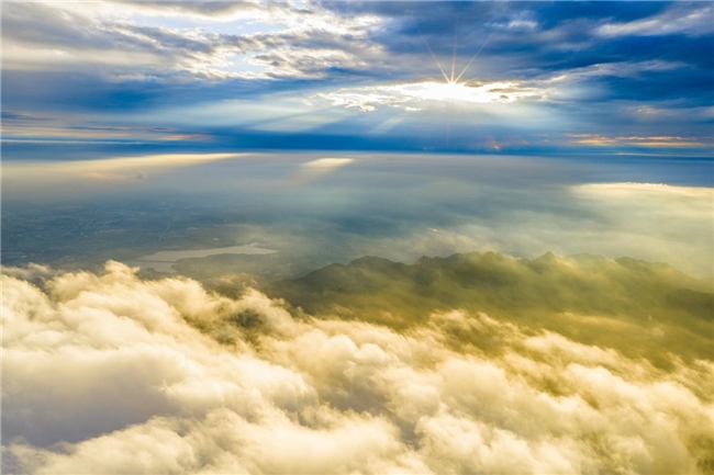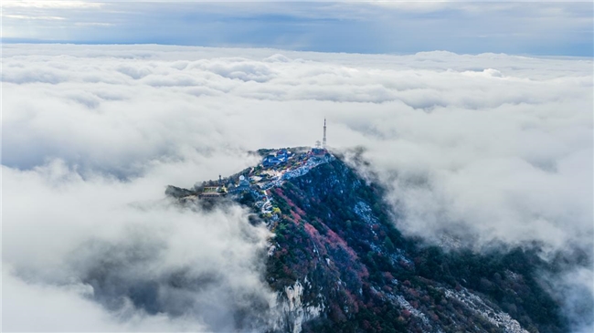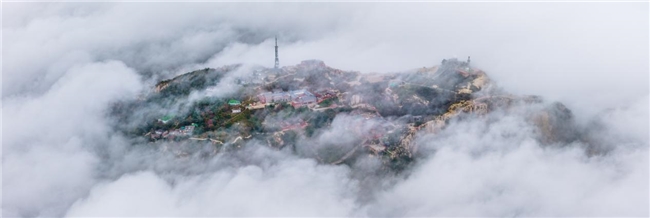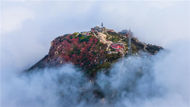 Когда море облаков покрывает горы, как хлопчатобумажная вата, вершина становится сценой в стране чудес. Красные кленовые листья, желтые гинкго и зеленые сосны окрашивают слои цветов в облаках, как будто природа опрокинула палитру и втирала великолепные осенние цвета в море эфирных облаков.